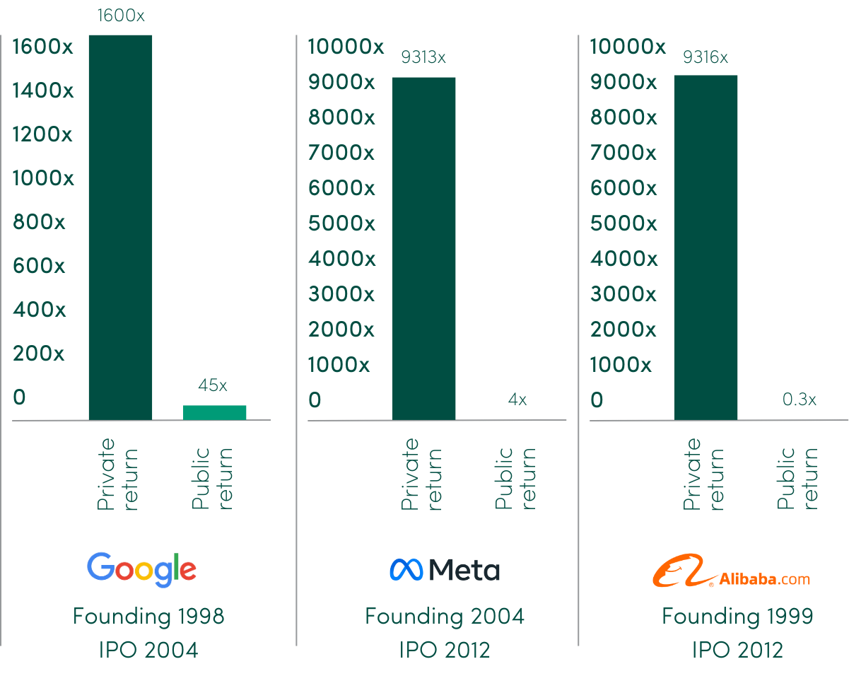 As companies stay private for longer, investors without access risk missing out on high-growth stage investment opportunities. This can be evidenced when comparing public and private market performance.
